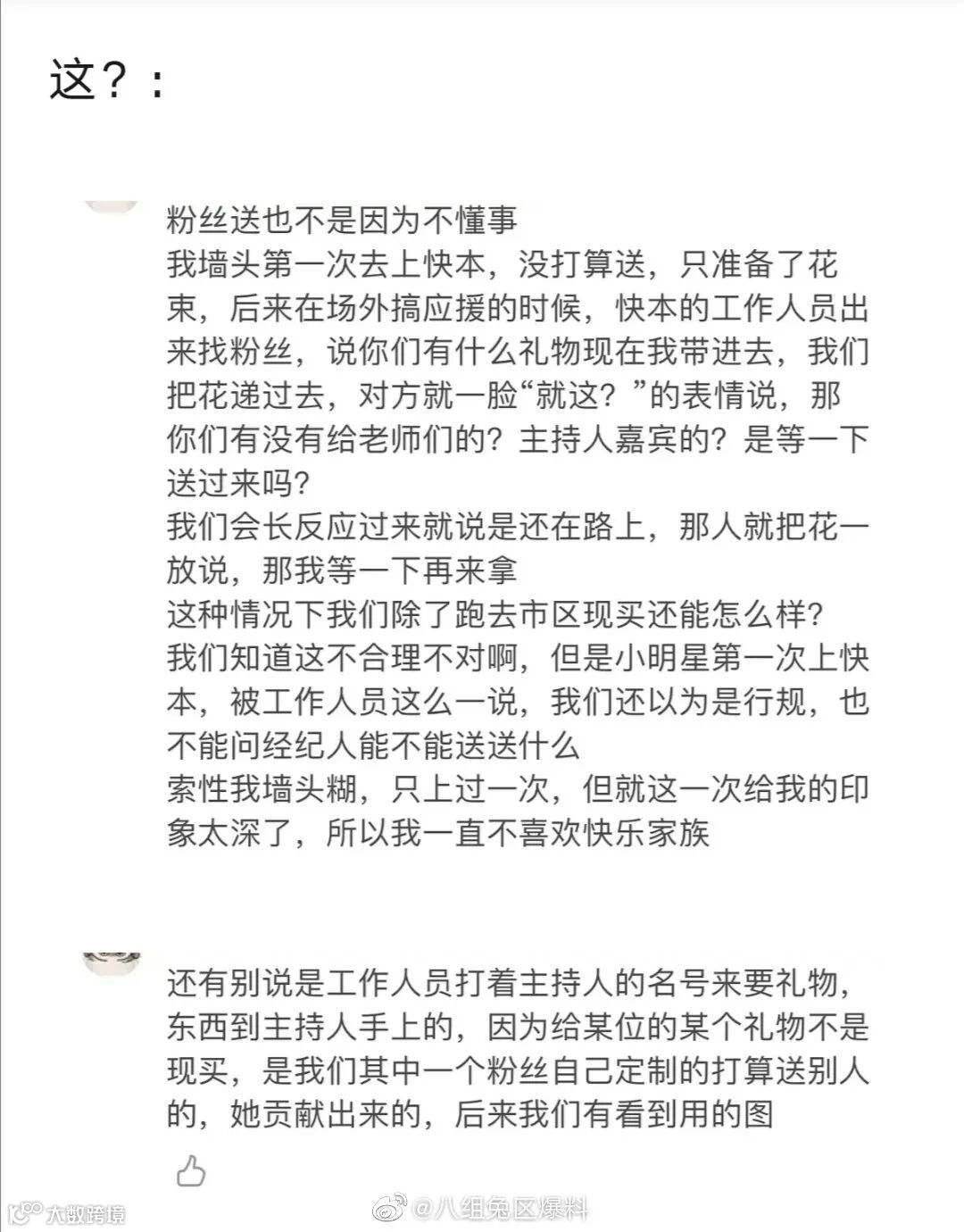 各家送的礼物陆续被扒,也有粉丝出来爆料——