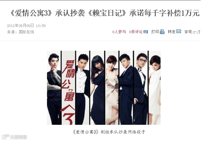 后来《爱情公寓》剧组表示“将按原创每千字一万元的标准补偿稿酬”。