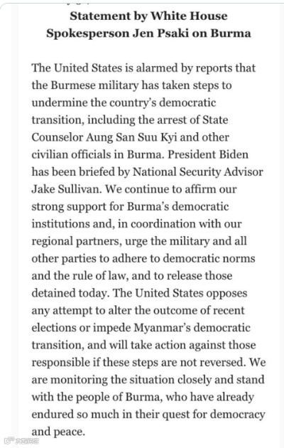 美国白宫发布了拜登政府就缅甸最新局势的声明。这份声明称,拜登政府表示美国会继续支持缅甸的民主,并与区域伙伴一道要求缅甸军方和各方势力尊重民主和法治。拜登政府还称美国反对一切篡改民主选举结果或阻碍缅甸民主过渡的行为,而倘若这些行为不被纠正,美国就将采取措施针对相关责任人。最后,拜登政府称美国将继续密切关注事态进展并与“追寻和平与民主”的缅甸人民“站在一起”。