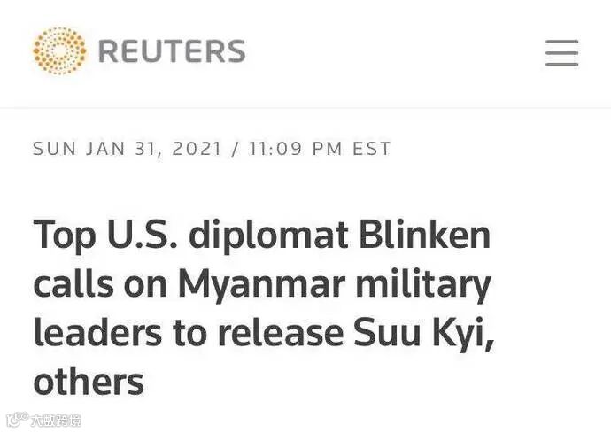 美国国务卿布林肯呼吁缅甸军方领导人,释放国务资政昂山素季及其他被扣押人士。