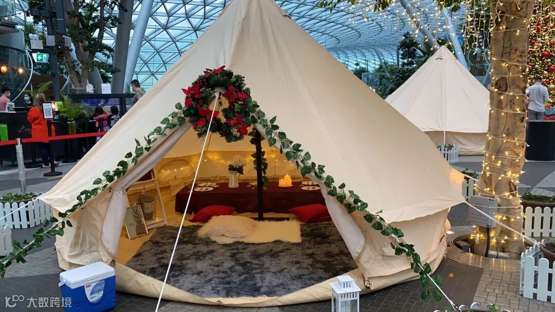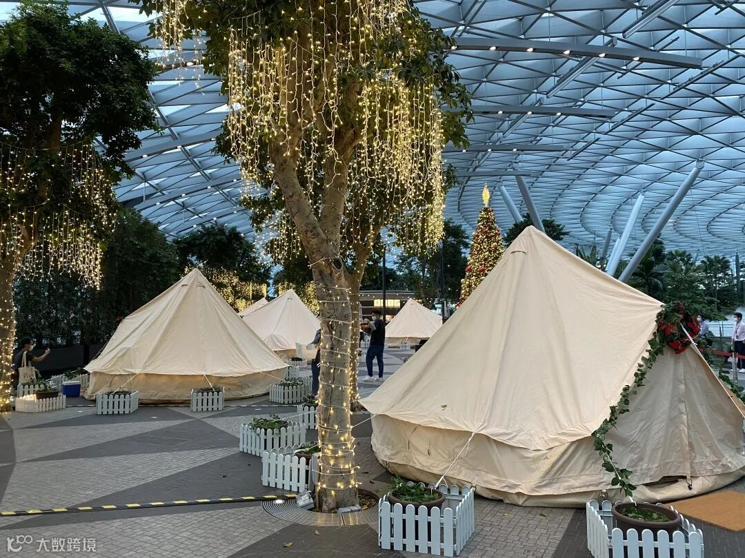 在星空下沉浸在清凉舒适的魔幻之夜,并在Cloud9 Piazza 广场的豪华露营(Glamping in theClouds)欣赏汇丰银行雨旋涡的壮丽景色。Cloud9Piazza 广场的豪华露营位于星耀樟宜的最高层,在高耸的榕树旁搭设帐篷,帐篷上点缀着仙女的灯饰。