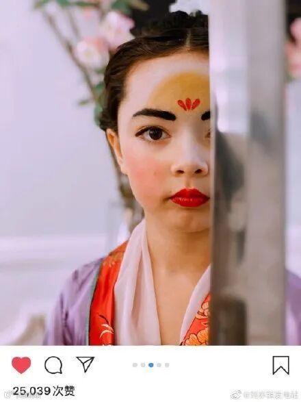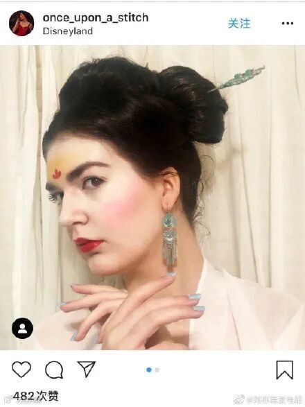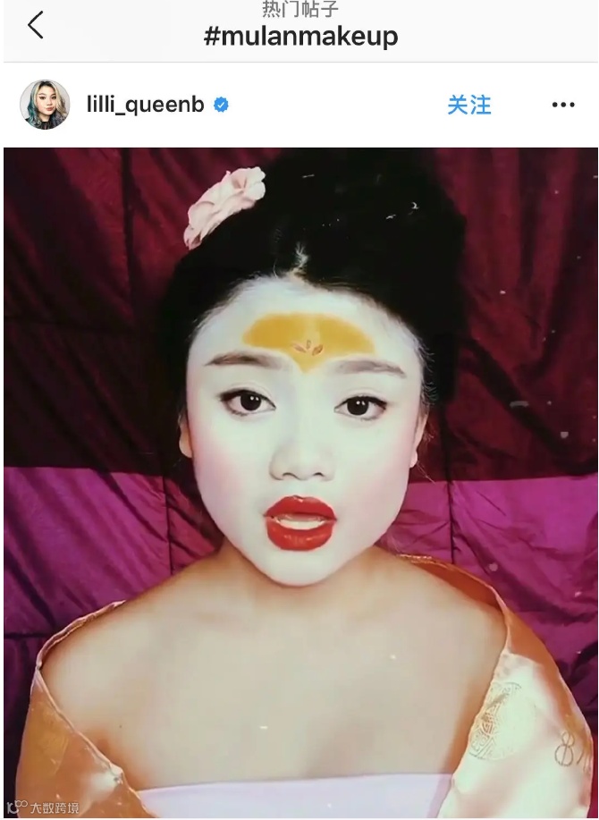 不少外国网友都在社交网站中上传了自己模仿花木兰的“妆容”,而这个妆容正是国内网友颇有争议的刘亦菲额头贴“花黄”,两个红彤彤大脸蛋的妆容。