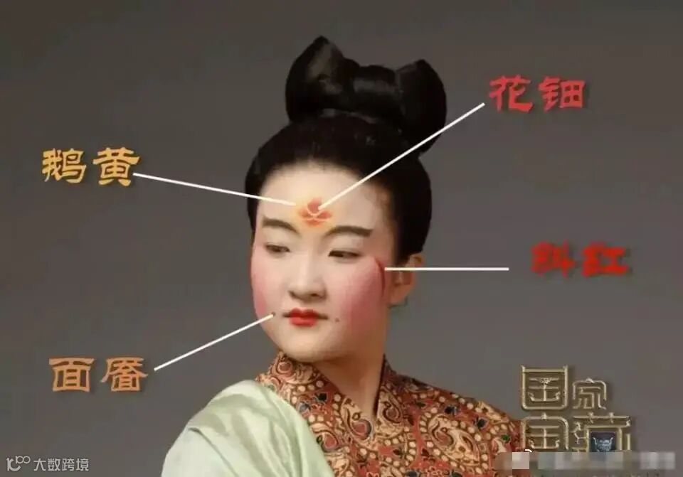 《国家宝藏》里面也提到过,女子喜在额间涂染鹅黄、贴花钿,这里的鹅黄就类似咱们现在说的高光,都是用来修饰脸型的。