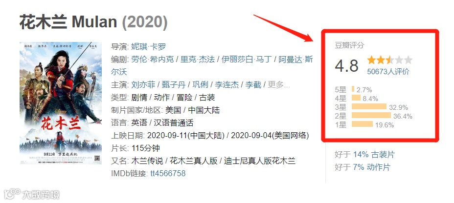 不少观众已经看过《花木兰》了,但豆瓣评分竟一度下滑至4.8分。
