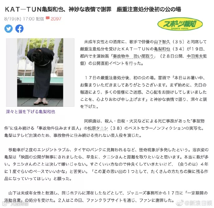 19日,自龟梨和也、山下智久一同受到杰尼斯事务所的严重警告处分后,龟梨首次出现在公开场合。他表情严肃地说道:“感谢大家今天到来现场。首先,对于前几天的报道给很多人带来了困扰和担心,我由衷地表示歉意。”发言结束后,他向大家鞠了一躬。