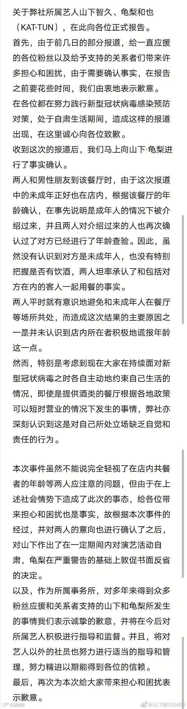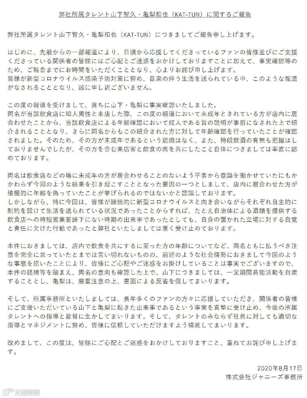 最终两人所属的杰尼斯事务所在官网上发表了对两人的处分。
