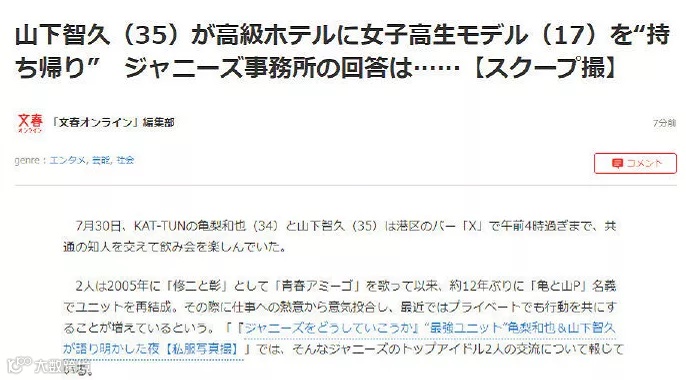 8月初,日本杂志《周刊文春》爆出,山下智久在7月30日和好友龟梨和也一起参加了一场酒会。