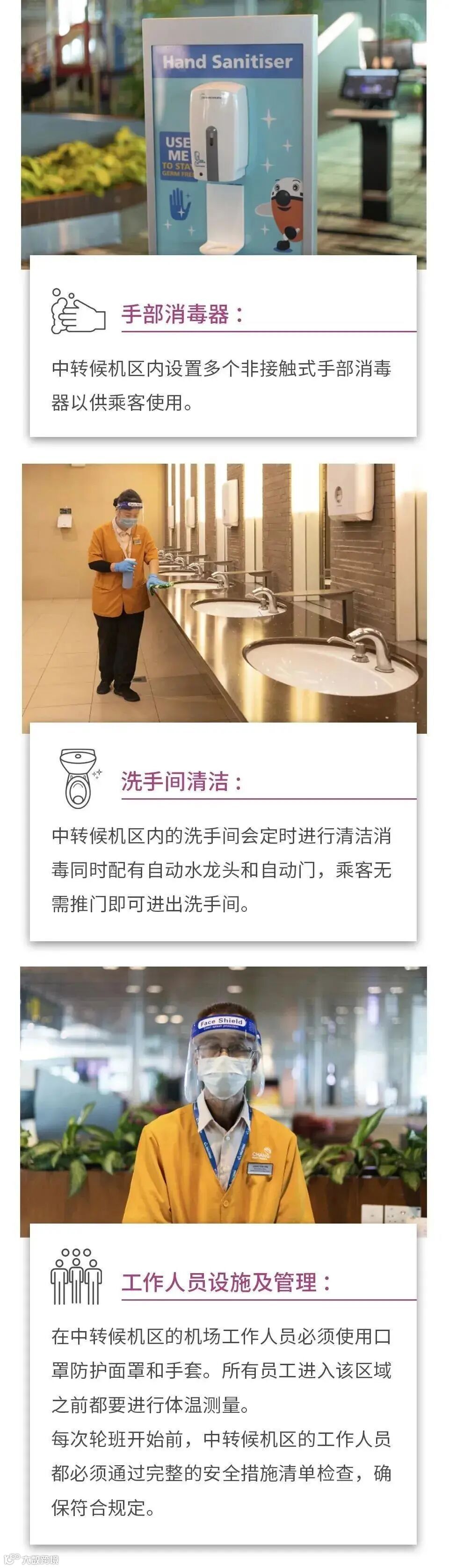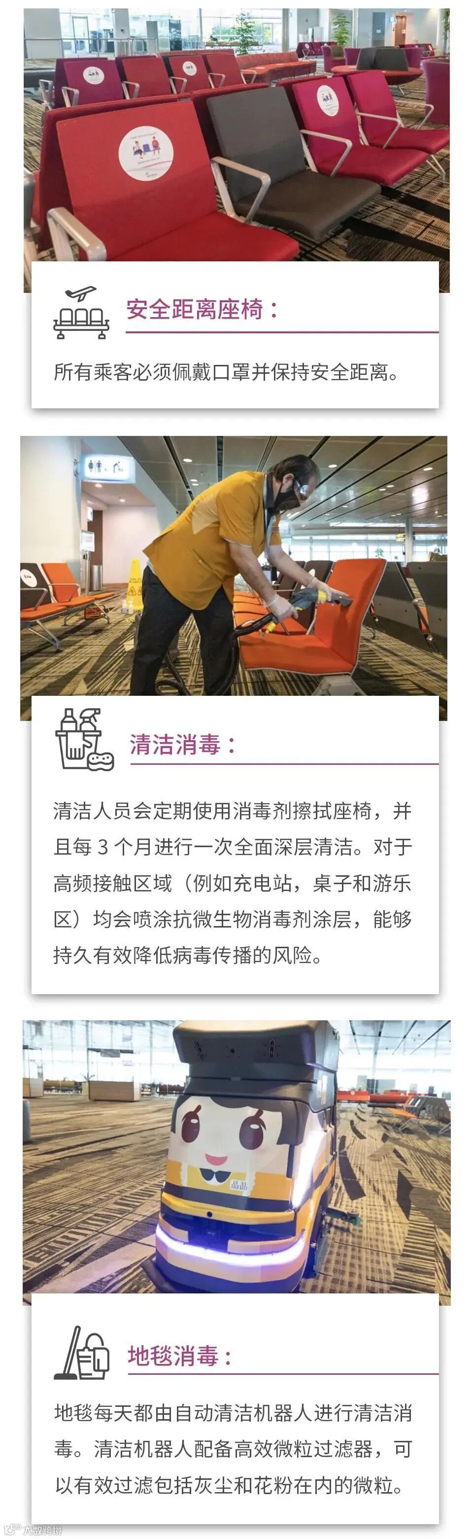 为乘客提供安全的环境,对樟宜机场来说至关重要。在转机的每个阶段,樟宜机场都采取了相应的安全和清洁消毒措施,以保障乘客和机场工作人员的安全。