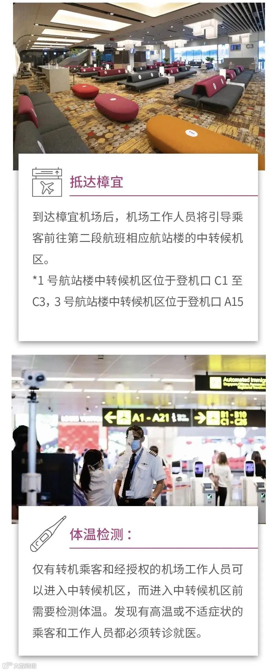 为了给转机乘客提供更为安全、便利、舒适的转机体验,樟宜机场设置了全新的中转候机区,提供贴心的候机设施。转机区域的工作人员值班前都必须参与班前准备会,再次了解相关安全措施及注意事项。