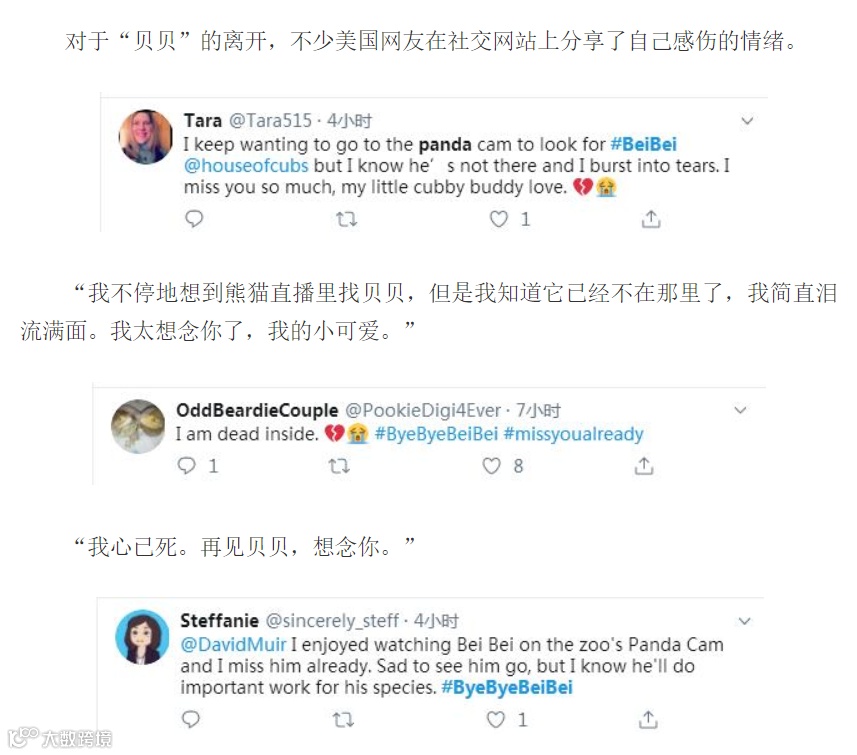 2019年11月19日,在华盛顿美国国家动物园出生和长大的雄性大熊猫“贝贝”结束了4年的旅美生涯,乘专机回国。