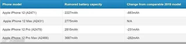 iPhone12 Max为2775mAh、iPhone12 Pro为2815mAh、iPhone12 Pro Max为3687mAh。而iPhone11、iPhone11 Pro、iPhone11 Pro Max分别是3110mAh、3190mAh、3969mAh,每个机型都下降了300mAh左右。