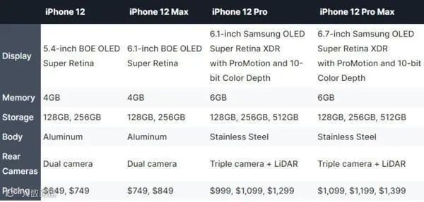 iPhone12 Max(6.1英寸):64GB—799美元,128GB—849美元,256GB—949美元;