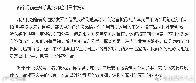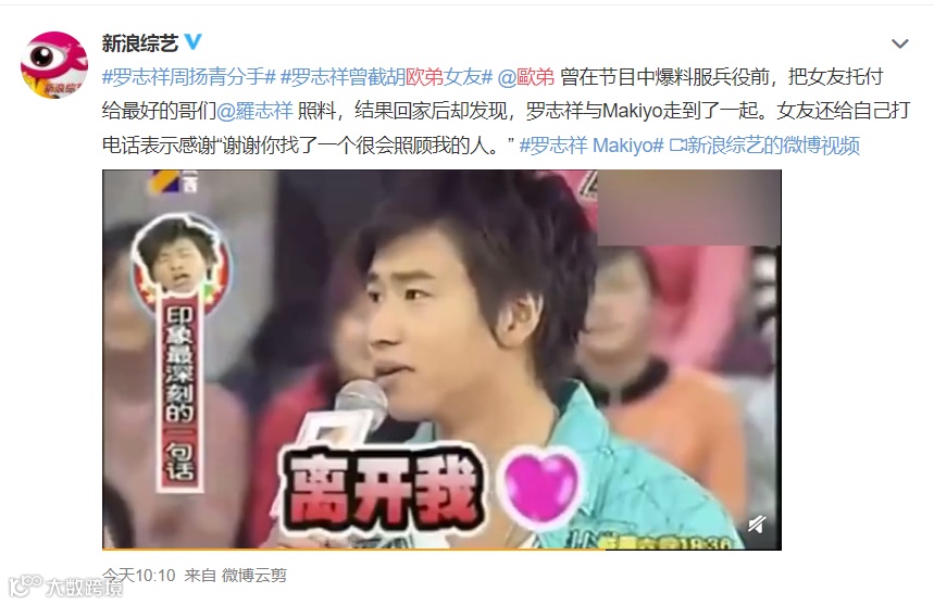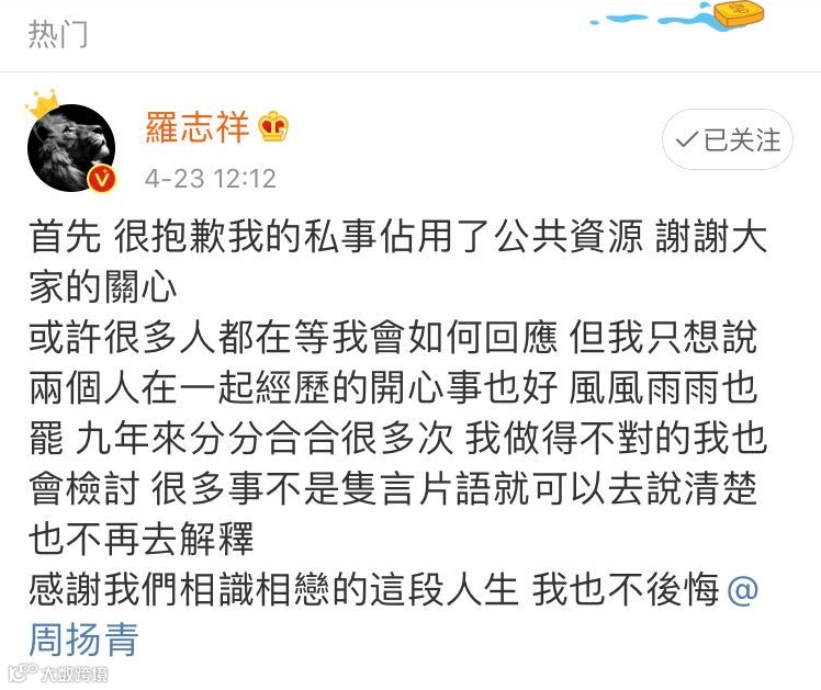 今天一早,周扬青发微博表示和罗志祥分手已经有一段时间了。