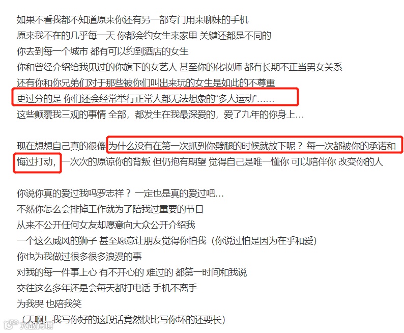 同时,在微博中指出了罗志祥多次劈腿,且进行“多人运动”。
