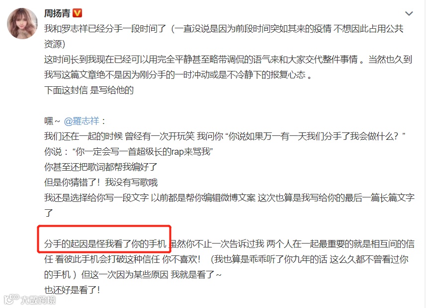 周扬青的微博写的十分简洁明了,首先表明分手的原因是自己看了罗志祥的手机,并发现了一些事情。