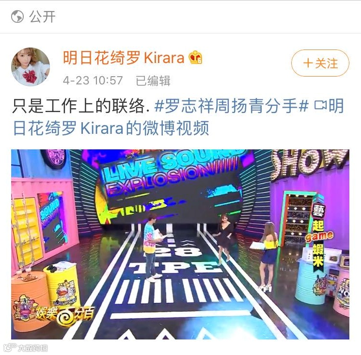 日本AV女优明日花绮罗火速发微博表示和罗志祥“只是工作上的联络”。