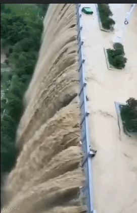 汹涌的洪水还穿过街道,从堤坝涌入乌江,形成了一条近千米宽、气势磅礴的大瀑布,视觉效果十分震撼。