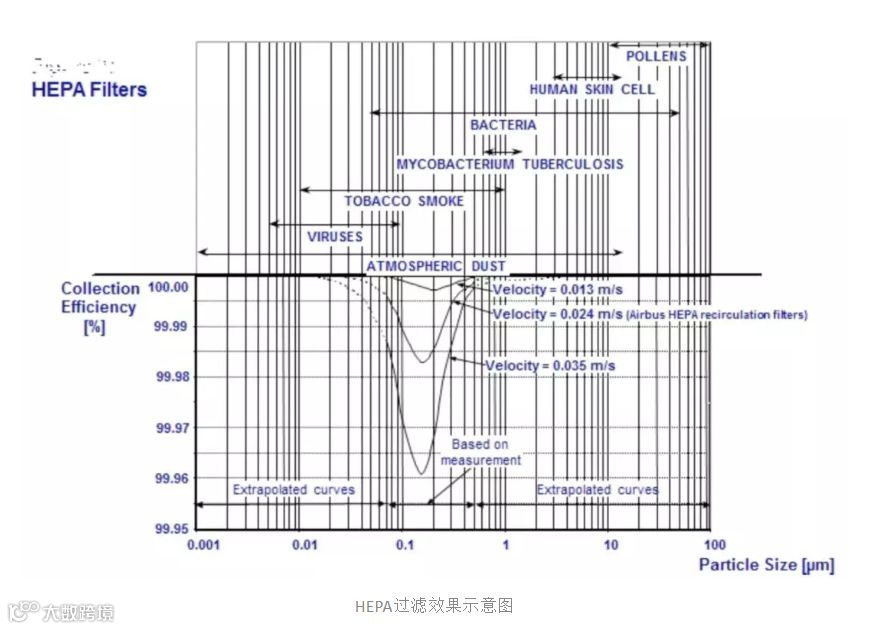 空客飞机客舱中的空气由从外部吸入的新鲜空气与经过高效过滤系统的再循环空气混合而成,该过滤系统称为高效微粒捕集器(HEPA)。HEPA过滤器对于0.3微米级别颗粒的过滤效率超过99.97%,对于更大或更小颗粒的过滤效率则更高。相关测试证明,HEPA能够提供符合医院手术室标准的空气。下图显示,对于典型病毒大小范围内的颗粒(0.01至0.2微米),其过滤效率超过99.99%。