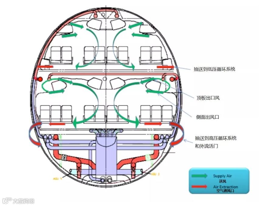 正常运行中,只有不到一半的空气被过滤和再循环,其余则来自外部吸入的新鲜空气。客舱再循环风扇带来的气流(再循环空气)可以帮助客舱内的空气经正确的流向流动。过滤后的再循环空气和外部吸入的新鲜空气混合后,在客舱内自上而下流动,从头顶行李箱的上方或下方(视飞机型号而定)进入客舱,再从底部(客舱地板的高度)被抽出,这一设计旨在防止客舱内空气的前后流动。值得一提的是,盥洗室和厨房区域的绝大部分空气是被抽出并直接排出飞机的,不会再次进入客舱区域(不进行再循环)。 再循环空气是飞机整体空气流通的重要部分,该气流流经乘客并将乘客可能产生的空气污染物向下由该乘客座位底部被抽出客舱。客舱内的空气平均每3分钟更新一次,通过使用再循环空气,这一频率可以提高至每2分钟更新一次。