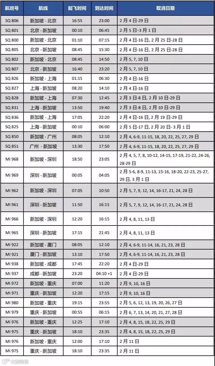 2.国航:取消2月2日-2月29日成都新加坡,新加坡北京航线近几天仍然执行的新加坡出发航班有:2月2日的CA776 (17:45起飞),2月2至2月4日的CA970航班(00:05起飞),后续航班是否全部取消或部分取消待定,建议旅客将行程提前到4日以前,免费改期;