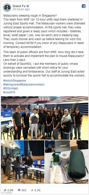 裕廊集选区国会议员傅海燕(Grace Fu)昨晚(3月19日)在脸书上赞扬了社会和家庭发展部(MSF)的专门团队为安置这些马来西亚劳工所做的辛勤工作。