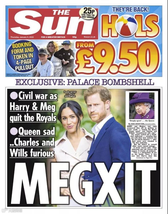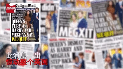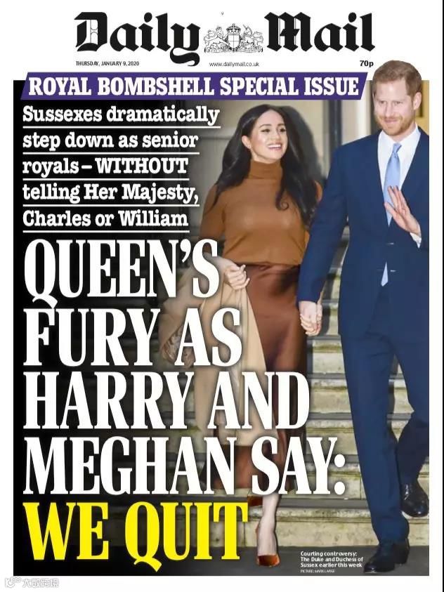 《每日邮报》看热闹不嫌事大,在标题上大书:女王怒了,哈里梅根说:我们不干了。