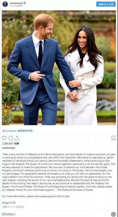 当地时间1月8日,他们在Instagram上发表声明宣布,将不再担任王室高级成员的身份,追求“经济独立”。