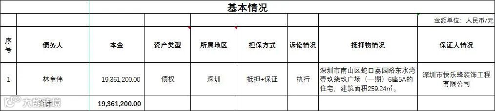 2、抵押物主要为位于深圳市南山区蛇口荔园路东水湾壹玖柒玖广场(一期)6座5A的住宅,建筑面积259.24㎡。