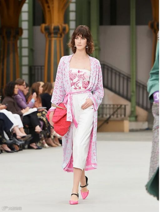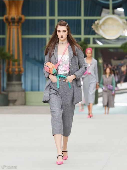 延续着香奈儿以往的旅程——软呢外套、链带细节及菱格纹皮革仍清晰可见,并在经典的黑色、白色、裸色及驼色中增加蓝及粉色,为整体系列增添清新的氛围。