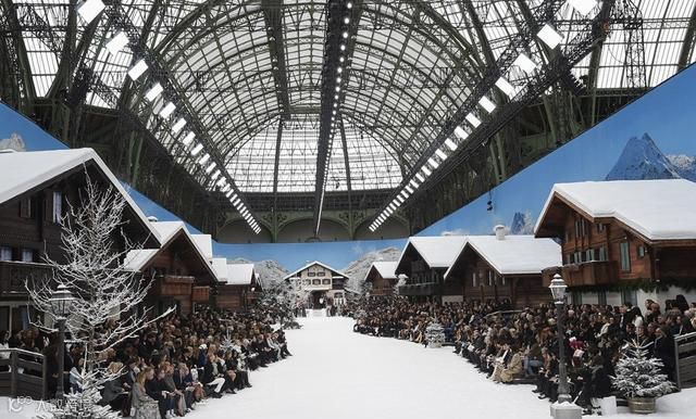 整场秀在巴黎大皇宫(Grand Palais)的玻璃屋顶下进行,现场被打造成了阿尔卑斯山的滑雪胜地。白雪皑皑的雪景,优雅又梦幻。