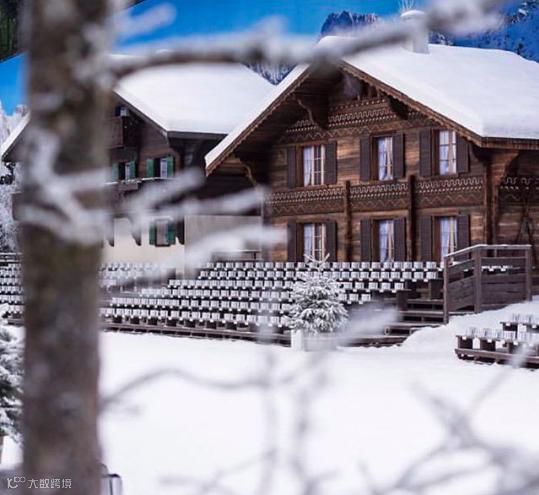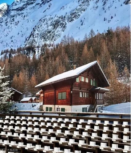 街道上鳞次栉比的是十几个瑞士木屋,烟囱里冒着烟,屋顶上覆盖着雪,在山峰和蓝天的映衬下显得神秘而静谧。