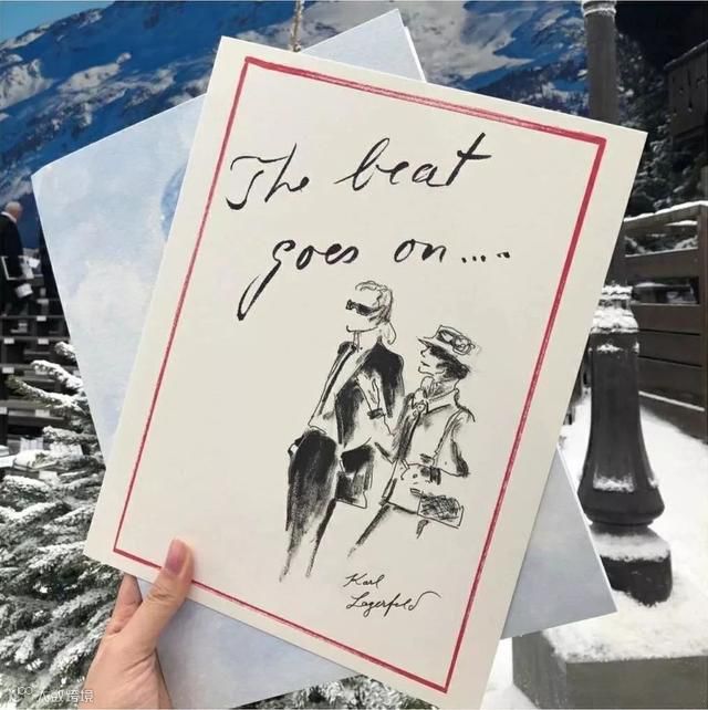 这张邀请函上画着 Karl Lagerfeld 与 Coco Chanel 这两位香奈儿灵魂人物手挽手,其上是手写体的 “The beat goes on(影响仍在延续)...”