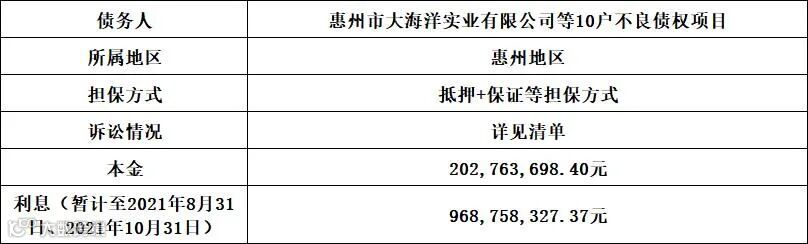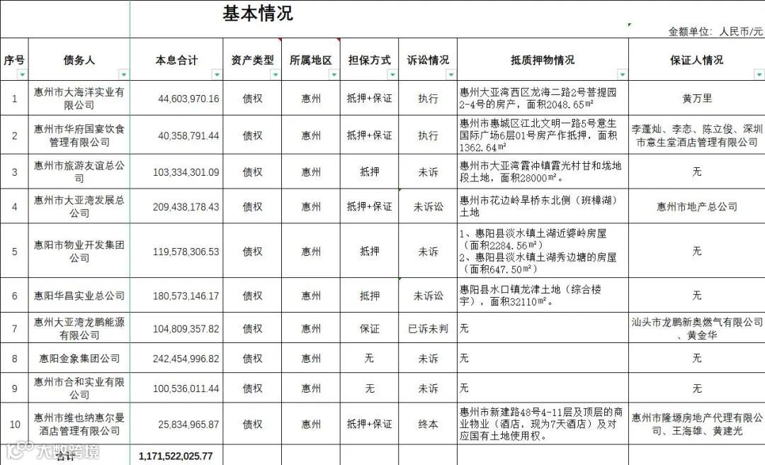 广州广永投资管理有限公司拟公开征集惠州市大海洋实业有限公司等10户不良债权项目的意向客户,项目基本信息如下: