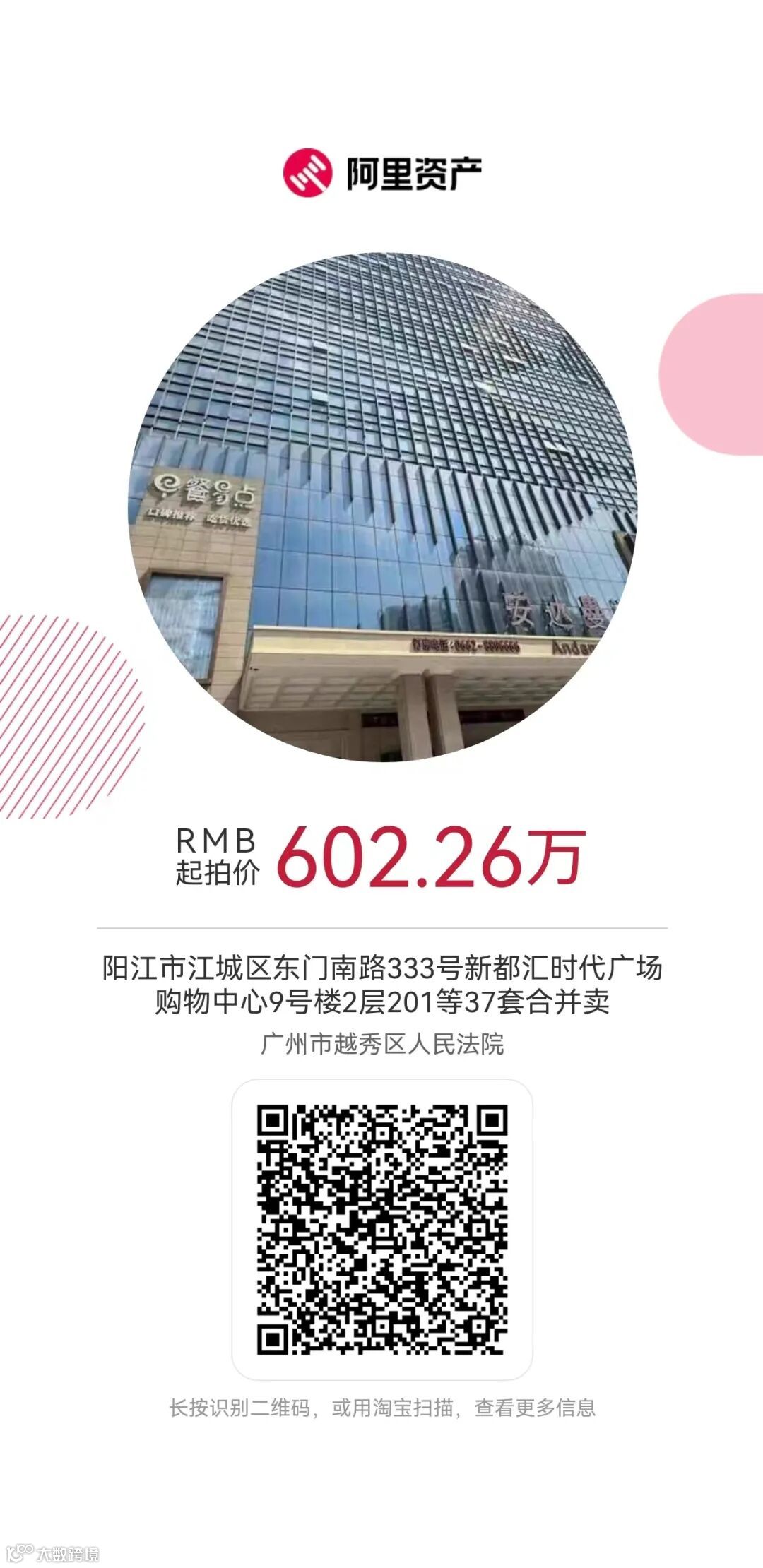 阳江市江城区东门南路333号新都汇时代广场购物中心9号楼2层201、202、203、205、206、207、208、209、210、230、231、232、233、235、236、237、238、239、240、241、242、243、245、246、247、248、249、273、275、276、277、278、279、280、281、282、283号铺(共37套)合计1281.08平方,起拍价:人民币6022600元,保证金:人民币602260元,增价幅度:人民币20000元及其倍数。