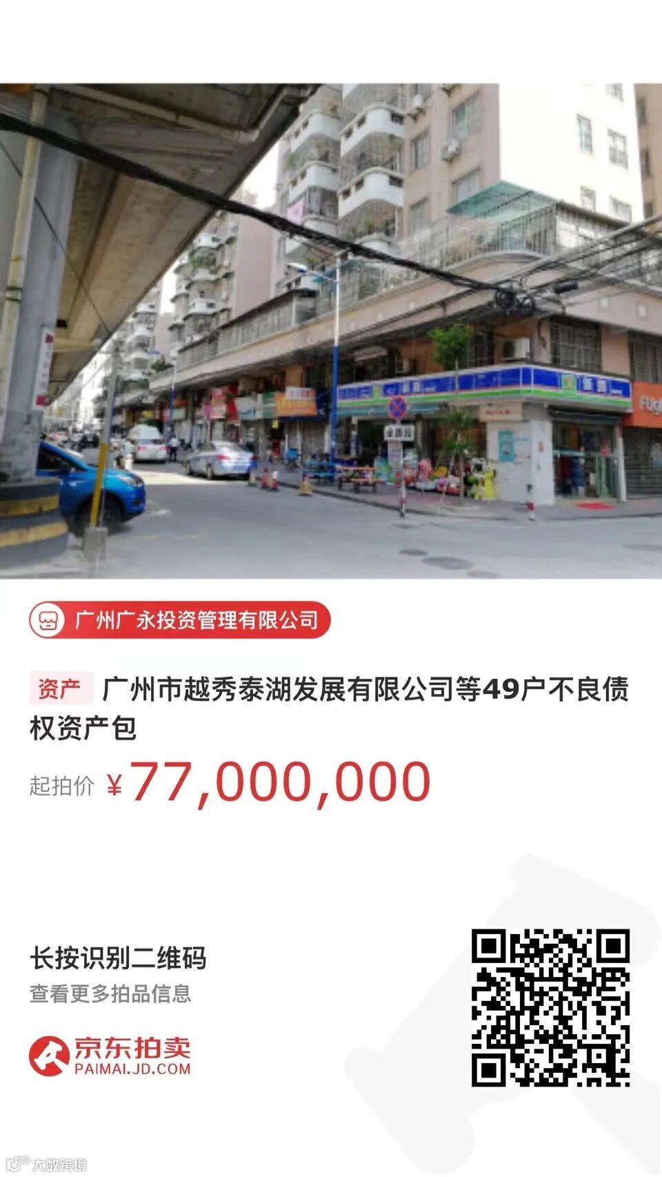 广州广永投资管理有限公司将于2022年6月30日10时至2022年6月30日16时止(延时的除外)在京东网资产竞价网络平台上对持有的广州市越秀泰湖发展有限公司等49户不良债权资产包进行公开挂牌转让,转让基准日2021年8月31日。