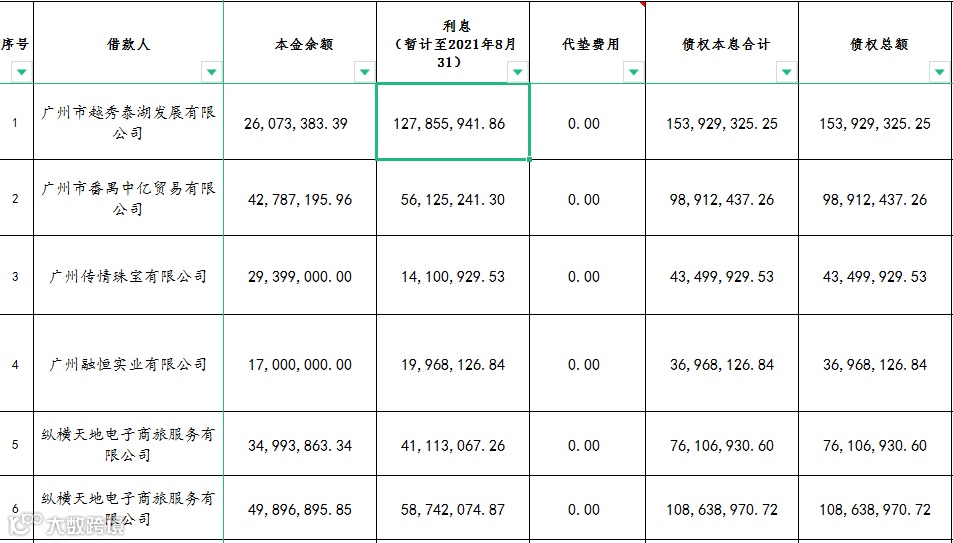 广州市越秀泰湖发展有限公司等49户不良债权资产包债权总额1,596,215,746.71元,其中本金余额为550,794,819.01元,利息为1,045,420,927.70元,具体情况如下: