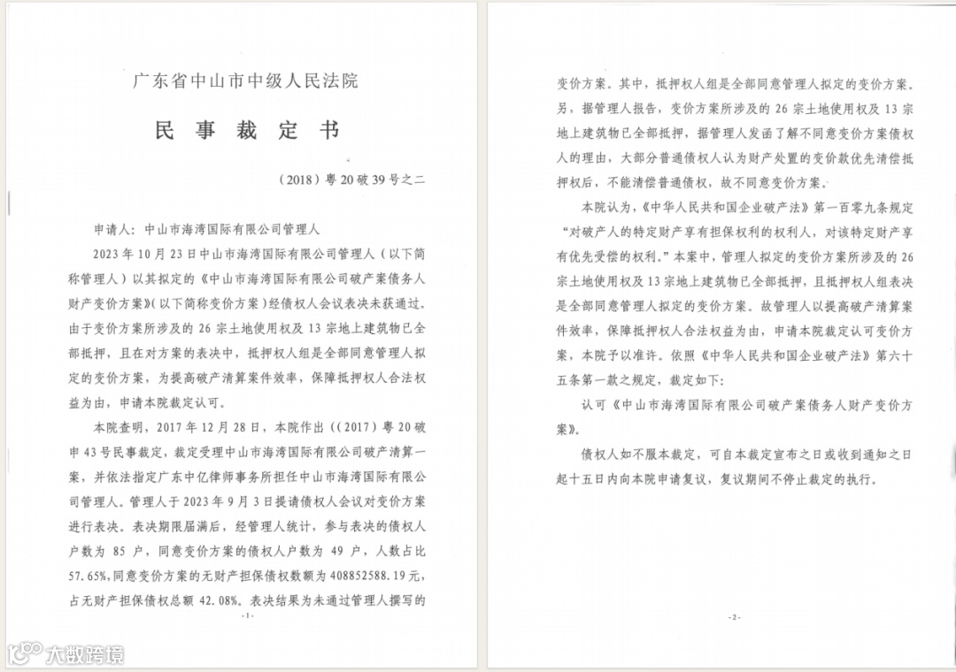 4、2023年11月1日,中山市中级人民法院出具(2018)粤20破39号之二民事裁定书,裁定认可《中山市海湾国际有限公司破产案债务人财产变价方案》,管理人已先通过京东网络拍卖平台发布资产推介招募公告,招募不成的,即在京东网络拍卖平台上按照变价方案进行拍卖。