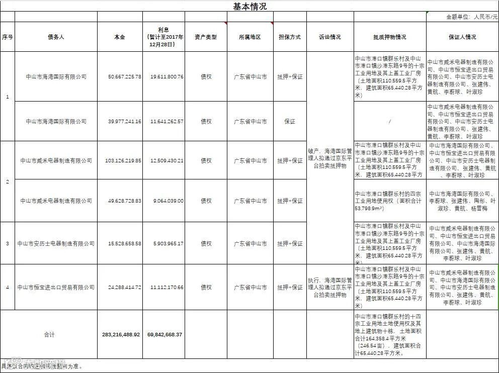 广州广永投资管理有限公司拟公开征集中山市海湾国际有限公司等4户不良债权资产包的意向客户,项目基本信息如下:
