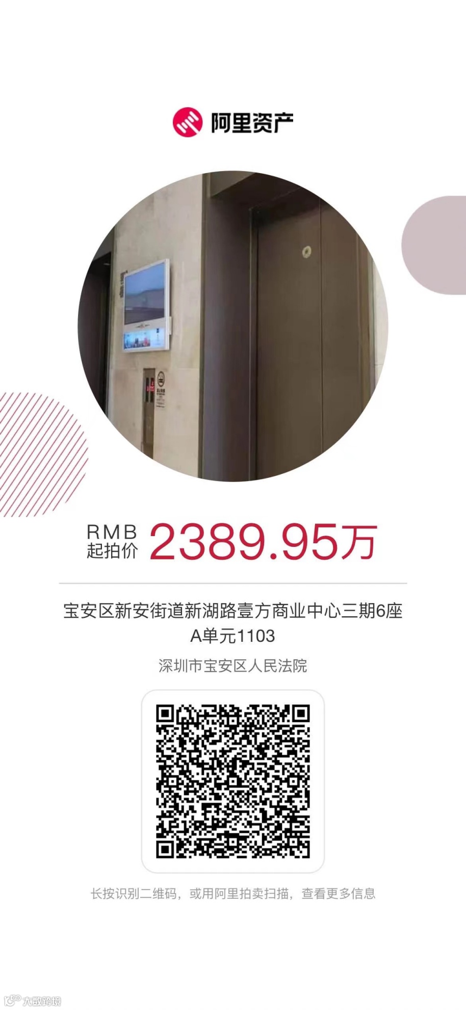 1、拍卖标的:宝安区新安街道新湖路壹方商业中心三期6座A单元1103房产【不动产权证明号:粤(2018)深圳市不动产权第0086265号】;拍卖物建筑面积:173.21平方米;拍卖物用途:市场化商品房;拍卖物性质:住宅。