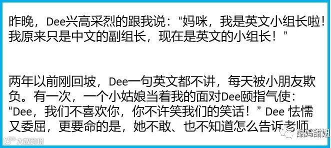 Dee 边哭边和我说,同学之间的小组讨论,她插不上嘴、不会讨论,并且很怕别人否认她的观点。最要命的是,她觉得自己越来越没用,对同学都没有贡献。Dee:妈咪,我永远都不能像F那么优秀,而且我已经很努力了。