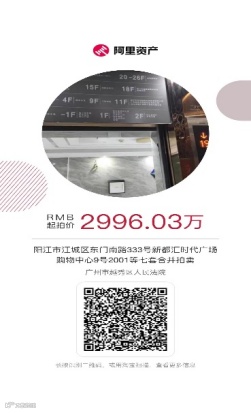 阳江市江城区东门南路333号新都汇时代广场购物中心9号2001、2101、2201、2301、2401、2501、2601(共七层)每层1344.76平方合计9413.32平方,起拍价:人民币29,960,341元,保证金:人民币2,996,034元,增价幅度:人民币100,000元及其倍数。