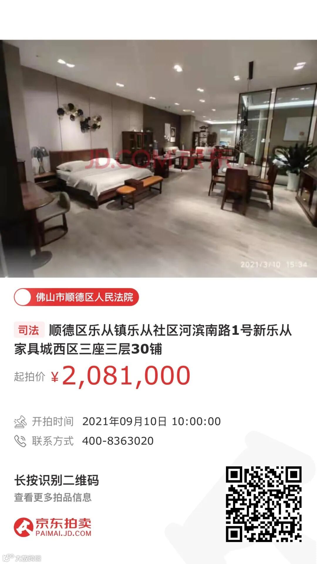 一、拍卖标的:位于佛山市顺德区乐从镇乐从社区河滨南路1号新乐从家具城西区三座三层30铺。