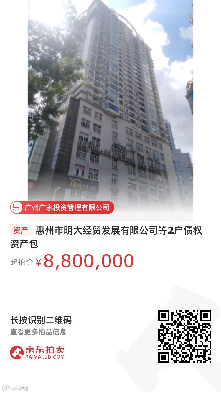 广州广永投资管理有限公司将于2021年7月27日10时至2021年7月27日16时止(延时的除外)在京东网资产竞价网络平台上对持有的惠州市明大经贸发展有限公司等2户债权项目进行公开挂牌转让,转让基准日2021年6月30日。