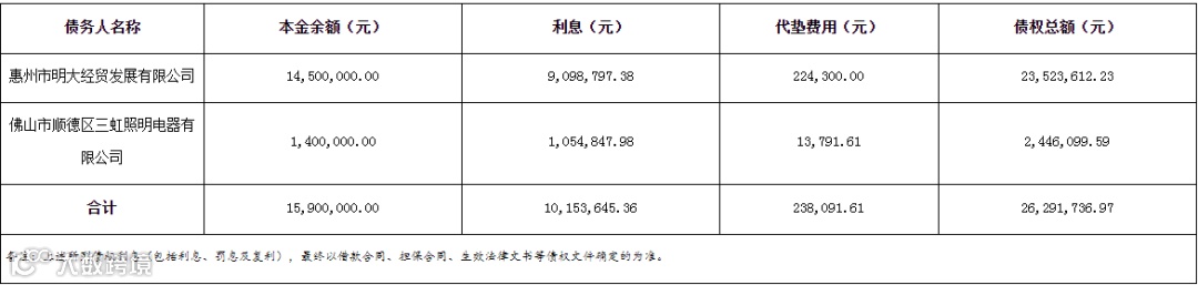 惠州市明大经贸发展有限公司等2户债权资产包债权本金、利息、代垫费用等如下:
