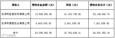 云浮市致景石材有限公司等2户债权本金、利息等如下: