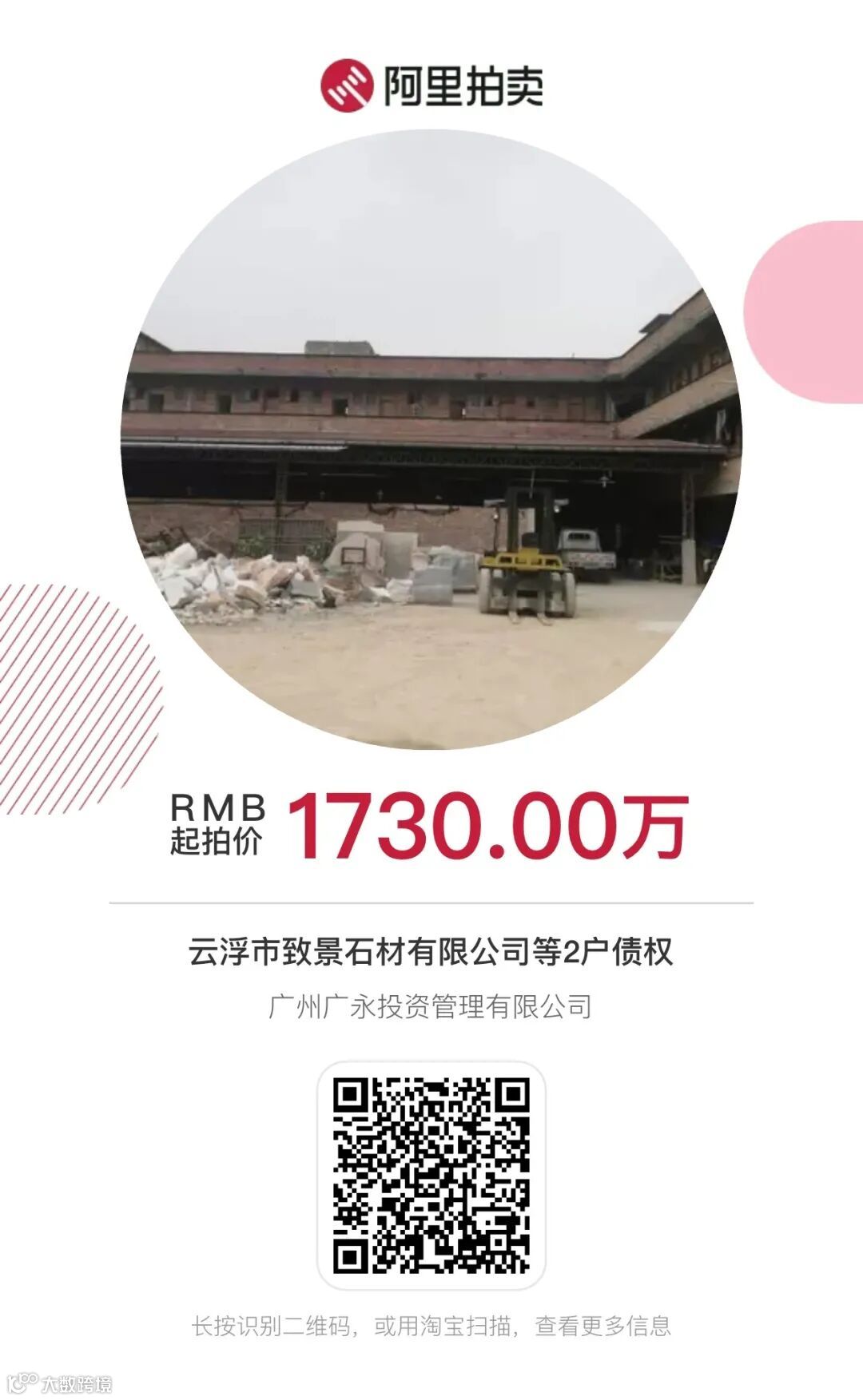 广州广永投资管理有限公司将于2020年9月30日9时至2020年9月30日16时止(延时的除外)在淘宝网资产竞价网络平台上对持有的云浮市致景石材有限公司等2户债权进行公开挂牌转让,转让基准日2020年8月31日。