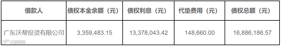 广东沃帮投资有限公司债权项目债权本金、利息等如下: