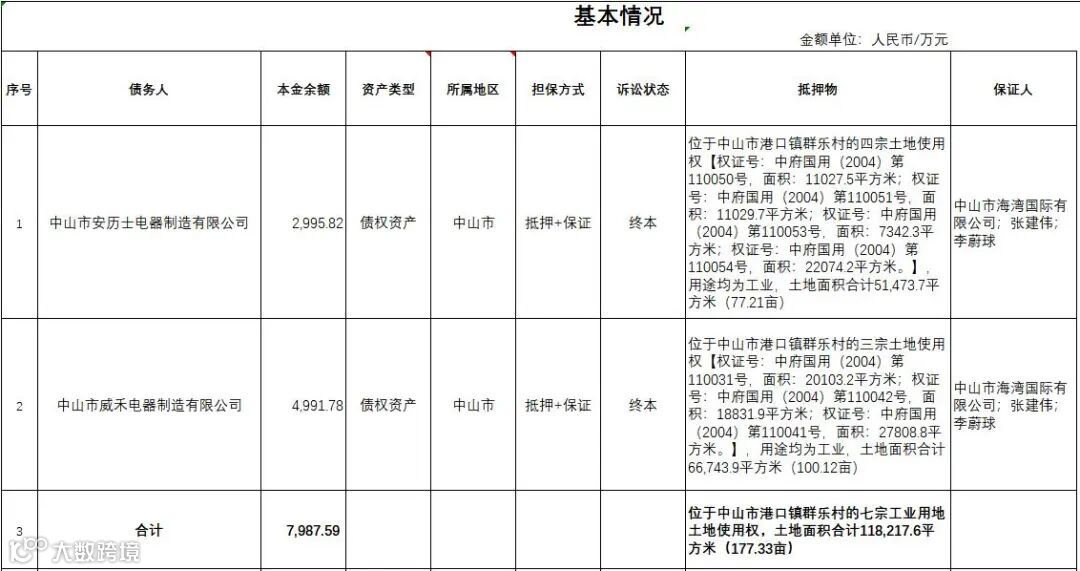 广州广永投资管理有限公司拟公开征集中山市安历士电器制造有限公司等2户债权资产包的意向客户,项目基本信息如下: