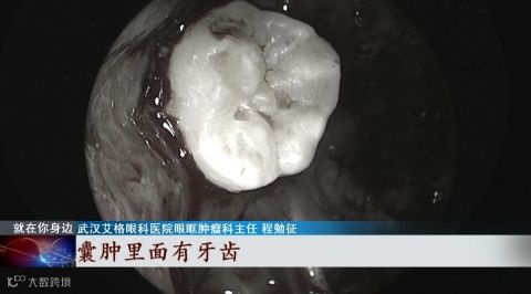 武汉艾格眼科医院眼眶肿瘤科主任程勉征发现:“拨开那个囊肿竟然发现了一颗牙齿,它的形态与我们正常的磨牙是一样的,跟一颗花生米差不多大。”