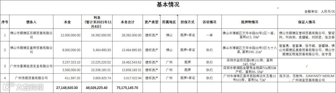 1. 债权总额为人民币7,517.51万元,其中,本金余额为人民币2,714.89万元,利息(暂计至2021年11月4日)为人民币4,802.62万元。